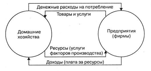 Представим самую простую картину экономических связей – упрощенную схему движения товаров и доходов продукции и денег. В ней будут присутствовать лишь две основные хозяйственные единицы: домашние хозяйства и предприятия. Мы абстрагируемся от внешних связей. В упрощенной схеме агрегируем «ручейки» и «реки» разнообразных товаров и услуг, расходов и доходов в однородные «потоки», протекающие между предприятиями и домашними хозяйствами, объединяющие их в хозяйственную систему (рис.1).