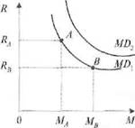 Представим данную функцию графически (рис. 18.2). Отложим по вертикальной оси номинальную ставку (норму) процента, а по горизонтальной — количество денег в обращении. Функциональная зависимость указанных переменных выражается кривыми MD1 и MD2, соответствующие различным уровням номинального национального дохода— (MD1-меньшему, а MD2-большему уровню). Они имеют отрицательный наклон, поскольку по мере уменьшения ставки процента спрос на деньги возрастает (при определенном уровне номинального национального дохода). При снижении ставки процента происходит снижение вдоль кривой спроса на деньги MD1 из точки А в точку В. С увеличением уровня номинального национального дохода происходит сдвиг кривой спроса на деньги из положения в MD1 в положение MD2. Деньги, обслуживая рыночную систему и являясь ее органической частью, подчиняются законам этой системы. Они включаются в процесс колебаний спроса и предложения, перемещения ресурсов в новые точки роста. Обращение денег обладает свойством значительно ускорить данные процессы. Мобильность ресурсов, на которой строится эффективная рыночная экономика, обеспечивается, прежде всего, перемещением денежных потоков. Именно они становятся источником финансирования нового производства.