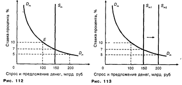 Результатом увеличения количества денег в обращении будет уменьшение ставки процента с 8 до 5%. Почему? При ставке процента, равной 7%, людям потребуется лишь 150 млрд. руб. Излишек предложения в 50 млрд. руб. они инвестируют в ценные бумаги или другие финансовые активы. В итоге курсы ценных бумаг будут расти, что эквивалентно падению процентной ставки. (Например, по долгосрочной облигации выплачивается процент в 300 руб. в год. Если цена облигации равна 3000 руб., то норма процента равна 10%. Если цена облигации увеличится до 4000 руб., то норма про цента составит лишь 7,5%). По мере падения процентной ставки цена хранения денег также уменьшается, население и фирмы увеличивают количество наличности и чековых вкладов. При ставке, равной 5%, равновесие на денежном рынке будет восстановлено: спрос, и предложение денег будут равны 200 млрд. руб. Что произойдет при уменьшении денежного предложения? При сокращении предложения денег возникает временный их дефицит. Население пытается преодолеть нехватку денег путем продажи акций и облигаций. Рост предложения на рынке ценных бумаг понизит их рыночную стоимость и одновременно увеличит процентную ставку. Более высокая процентная ставка повышает цену хранения денег и уменьшает их количество, которое люди хотят иметь на руках. Спрос на деньги сокращается, и денежный рынок возвращается к равновесию.