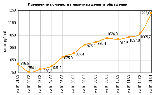 Тем не менее, денежная масса продолжает быстро расти, причиной чего является большой приток иностранной валюты из-за высоких цен на нефть. В результате российский экспорт значительно превышает российский импорт, что приводит к очень большому положительному сальдо платёжного баланса. Обменивая на рубли экспортные доходы в иностранной валюте, в оставшейся от её продажи импортерам и от вывоза капитала, экспортёры автоматически заставляют Центральный банк эмитировать рубль под покупаемую им валюту. Это является главной причиной ежегодного роста денежной массы в России (в полтора раза в 2003 г.) и быстрого роста золотовалютных резервов страны (смотри таблицу 1)