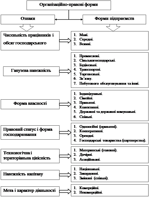 Кожне підприємство відрізняється від інших особливостями продукції, послуг, місцем розташування тощо. Не виключенням є і малі підприємства, які мають свої характерні ознаки. Однак можна виділяти певні основні ознаки, за якими доцільно класифікувати всі організаційно-правові форми підприємств (рис. 1.2).