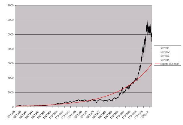 Красная линия на обоих рисунках - экспоненциальные тренды графиков индексов. Верхний рисунок иллюстрирует динамику роста индекса NASDAQ вплоть до "корректировки" весны 2000 года. Ниже - тот же график, включающий дальнейшее его поведение. Третий рисунок - иллюстрация динамики индекса Dow Jones, начиная с выхода США из Великой депрессии и по сей день. Долговременный экспоненциальный рост сам по себе уже является сомнительным подозрительным, тем не менее, Dow Jones значительно превысил даже этот тренд. В настоящее время его поведение выглядит неустойчивым. Аналогия с NASDAQ дает основания предположить ожидающую Dow Jones "корректировку", которая как минимум "провалит" индекс ниже линии экспоненциального тренда, как это произошло, к примеру, в 1987 году, но с более серьезными последствиями, учитывая нынешний уровень абсолютных значений сгорающих при корректировке средств. В случае продолжения его искусственного завышения ситуация станет еще более опасной и нестабильной. Выброс Dow Jones выше линии экспоненциального тренда, начавшийся в 1985 г. от значения индекса 4000 в два раза превышает по своему абсолютному значению всю амплитуду предшествующей истории индекса с 1935 года по момент начала броска выше экспоненты.