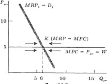 Кривая спроса на ресурс со стороны фирмы показывает, как изменяется объем потребленных фирмой ресурсов при изменении цен на них (при прочих равных условиях). Существует обратная зависимость между ценой ресурса — заработной платой, и количеством нанимаемых работников, что является следствием снижения предельного продукта труда по мере использования все большего объема этого ресурса в краткосрочном периоде. Фирма нанимает работников до тех пор, пока реальная заработная плата не станет равна предельной доходности ресурса. Таким образом, кривая спроса на ресурсы (DL ) в условиях совершенной конкуренции совпадает с кривой предельной доходности ресурса (MRP) и имеет ниспадающий характер (рис. 11.2).
