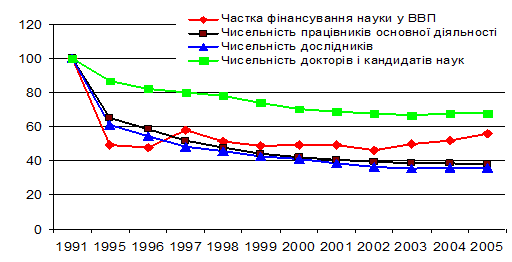 Найбільш високими темпами скорочення усіх показників відбувалося у першій половині 90-х років. Саме у цей період країна втратила значну частку наукового потенціалу і за індикатором науково-технічного розвитку відстала від європейських країн. Зменшення фінансування найбільш негативно вплинуло на галузевий та вузівський сектори науки.