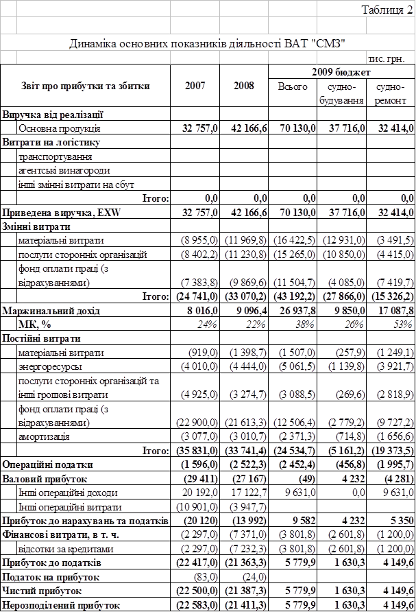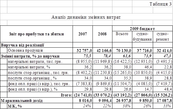 У таблиці 2 наведена динаміка показників роботи підприємства ВАТ «Севастопольський морський завод» за 2007-2008 роки, та план підприємства на 2009 рік. Окремо виділені змінні та постійні витрати по підприємству, а також кожні з них розглянуті за економічними елементами. Як видно з наведеної таблиці, діяльність підприємства є збитковою в цілому, але маржинальний дохід є додатнім.