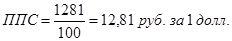 Паритеты покупательной способности валют (ППСВ) представляют собой количество единиц валюты, необходимое для покупки некоего стандартного набора товаров и услуг, который можно купить за одну денежную единицу базовой страны (одну единицу общей валюты группы стран — долларов США, евро, австрийских шиллингов). Например, для покупки в США условной корзины товаров необходимо иметь 100 долл. США. Для покупки той же корзины товаров в 2001 г. в России необходимо было иметь, с учетом покупательной способности российской валюты, 1281 руб. Это означает, что в 2001 г. паритет покупательной способности рубля по отношению к доллару США составил: