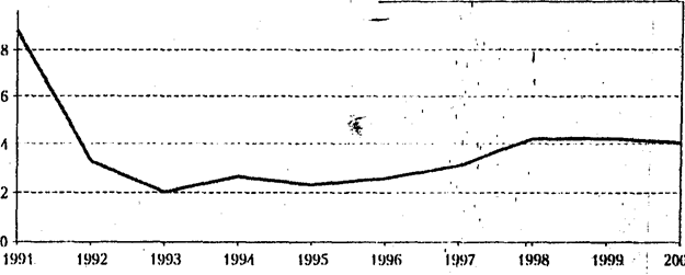 Темпы роста реальных доходов отдельных слоев населения зеркально отображали глубину их предшествующего падения. Наибольшими темпами росли доходы пенсионеров, хотя в 2000 г. они были восстановлены лишь до 82% уровня 1997 г., в то время как средняя зарплата в целом по экономике до 93%.