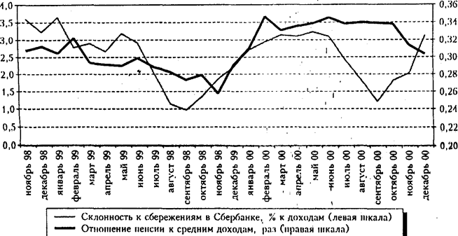 Общая склонность к сбережению под влиянием перечисленных факторов в 2000 г. достигла 6%, что вдвое меньше, чем в 1997 г. Этого в нынешних условиях недостаточно для того, чтобы величина накопленных сбережений .росла по отношению к среднемесячным доходам.