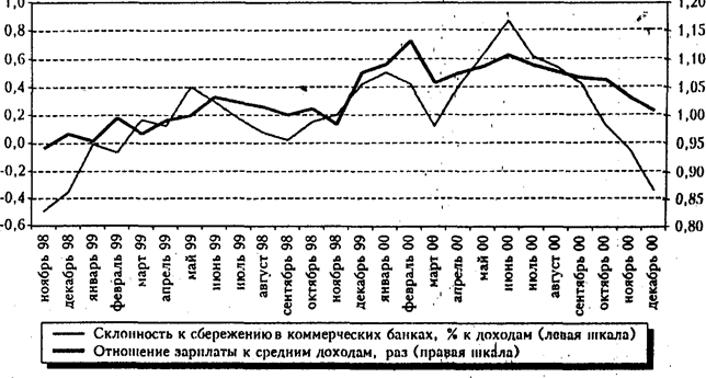 Новая закономерность характеризует динамику восстановления склонности к рубленым депозитам в коммерческих банках. Если до кризиса величина вкладов практически не была связана с динамикой традиционных (трудовых) доходов населения, то в последние два года появились признаки того, что круг вкладчиков расширяется в том числе за счет людей, получающих легальную зарплату. Хотя ее средний уровень (около 80 долл.) недостаточен для ускоренного формирования сбережений, в отдельных отраслях промышленности (нефтяной и газовой) летом 2000 г. средняя зарплата уже достигала 300-400 долл., что позволяет говорить о достаточно высоком сберегательном потенциале