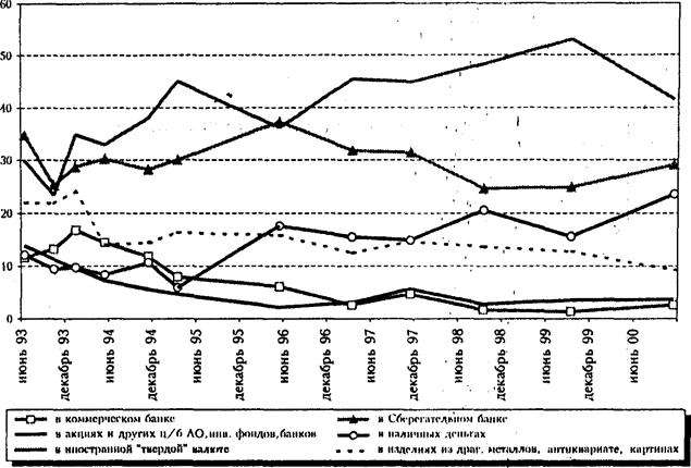 Как видно из рисунка 5, вплоть до конца 1999 г. привлекательность организованных форм хранения сбережений непрерывно снижалась. Пик доверия к Сберегательному банку пришелся на июнь 1996 г.: 37% респондентов выбрали его для вложения своих денег. В сентябре 1999 г. их было уже около 25%. Наибольшее доверие к коммерческим банкам люди испытывали в 1993-1994 гг. (12-17%), затем началось непрерывное снижение до 5-6%, а финансовый кризис летом 1998 г. и вовсе подорвал его (1-2% осенью 1998 г. и в 1999 г.). Аналогично развивались события с акциями и другими ценными бумагами, хотя доверие к этим финансовым инструментам у населения оставалось все же несколько выше - около 4%.
