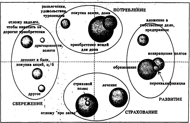 Анализ ответов респондентов с использованием процедур многомерного шкалирования показал, что у населения существуют четыре наиболее распространенные стратегии использования денежных средств. Их условно можно назвать потребление, сбережение, страхование и развитие.