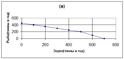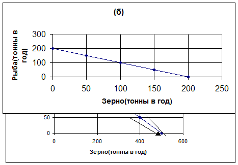 Часть (а) - это граница производственных возможностей для Испании. при наличии 1000 рабочих часов и затрат 2 рабочих часов на производство одной тонны зерна, Испания может собирать до 500 тонн зерна в год, если она не занимается ловом рыбы (точка В). Если Испания не занимается производством зерна, а сосредоточила все усилия на рыболовстве, то добыча рыбы (при затратах труда 4 часа на тонну рыбы) составит 2500 тонн (точка D). Линия, соединяющая эти точки, даст весь возможный набор комбинаций совместной добычи рыбы и производства зерна.