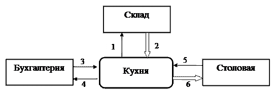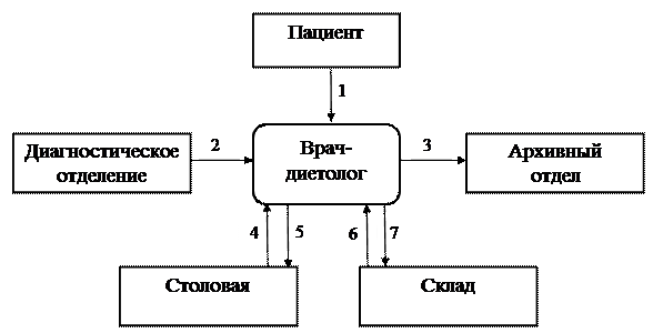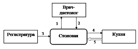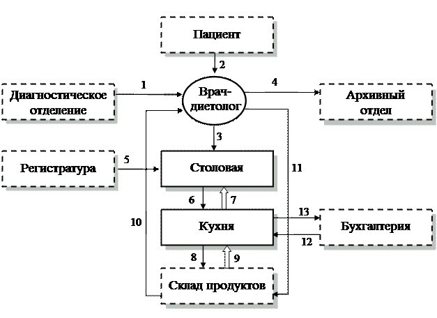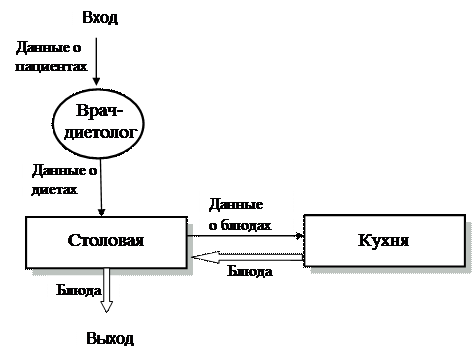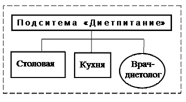 Вторая глава содержит структуру и описание подразделений подсистемы «Диетпитание» (врач-диетолог, столовая, кухня), а также информационных и материальных потоков между ними.