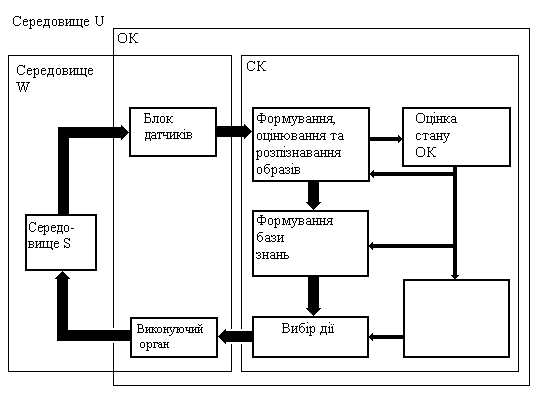На мал. 1.3.1 [1] подана система , під якою будемо розуміти середовище, у яке вкладений ОК, що містить у свою чергу КС. Як бачимо з малюнку, можна стверджувати, що КС управляє не тільки ОК, але й всією системою. Під середовищем у системі можна розуміти різні об'єднання об'єктів. Будемо називати середовищем W сукупність об'єктів, що лежать поза КС; середовищем S - сукупність об'єктів, що лежать поза ОК; середовищем U - всю систему.
