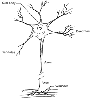 На мал. 3.1.1 [4], поданий у спрощеному виді біологічний нейрон. Схематично його можна розділити на трьох частини: тіло клітини, що містить ядро і клітинну протоплазму; дендрити - деревоподібні відростки, які служать входами нейрона; аксон, або нервове волокно, - єдиний вихід нейрона, що являє собою довгий циліндричний відросток. Для опису формальної моделі нейрона виділимо такі факти: