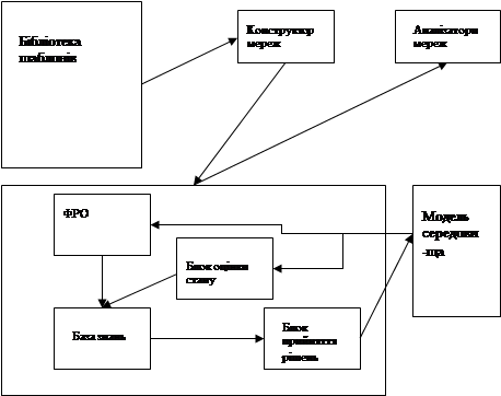 На приведеній схемі (рис 5.1) [1] зазначені основні класи об'єктів ядра системи і їхня взаємодія. Стрілками показані потоки даних при роботі системи. Кожному з основних блоків КС відповідає свій блок у системі. Чотири блоки: ФРО, БЗ, БОС і БПР складають КС. З формальної моделі НМ випливає, що блок - це ієрархічна структура, у якій елементи одного рівня сполучені в мережу і кожний з елементів рівня може бути мережею, що складається з елементів більш низького рівня. Розглядаючи обраний елемент будь-якого рівня, можна вважати його «чорною скринєю», тобто абстрагуватися від його змісту і внутрішньої будови. Наприклад, можна на деякому проміжному етапі конструювання КС абстрагуватися від нейро-мережевої реалізації блока верхнього рівня і спробувати різноманітні реалізації, причому необов’язково нейромережеві. Система не накладає обмежень на внутрішню будову кожного блока, тому воно може не мати внутрішньої ієрархії, а просто рекомендуватися деякою функцією виходу. Далі, у процесі розвитку КС, зміст окремих блоків може змінитись, можливо стати більш складним і ієрархічним, при цьому поведінка системи не зміниться, якщо новий зміст забезпечує функціональність старого в еквівалентності вихідних функцій. Таким чином, полегшується розробка системи, тому що з'являється можливість конструювання «зверху донизу», немає необхідності реалізовувати блок відразу через НМ, можна поставити тимчасову «заглушку», а в процесі розвитку системи ускладнювати, доповнювати або заміняти на цілком іншу внутрішню конструкцію блоків.