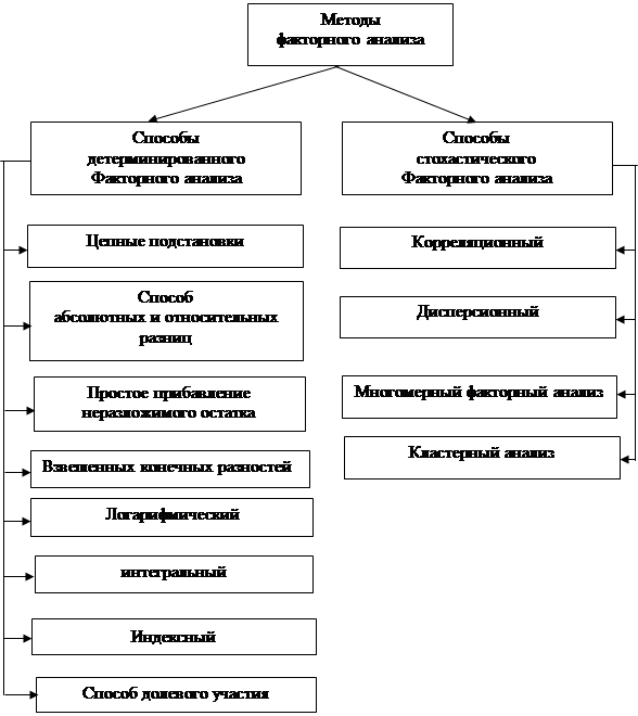 Функционально - детерминированная связь – это связь, при которой каждому значению факторного признака соответствует вполне определённое неслучайное значение результативного признака. Связь, при которой каждому значению факторного признака соответствует множество значений результативного признака (т.е. определённое статистическое распределение) – стохастическая (вероятностная) связь. Соответственно типу связи аналитические приёмы и способы делятся на методы детерминированного факторного анализа и методы стохастического факторного анализа.