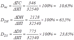 Для определения влияния каждого вида выплат на изменение фонда заработной платы рассчитаем долю (D) влияния каждого вида выплат на среднюю заработную плату: