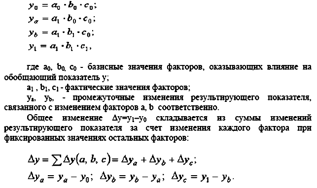 Метод абсолютных разниц является модификацией способа цепной подстановки. Изменение результативного показателя за счет каждого фактора определяется как произведение абсолютного прироста исследуемого фактора на базисную величину факторов, которые находятся справа от него и отчетную величину факторов, расположенных слева от него в модели.