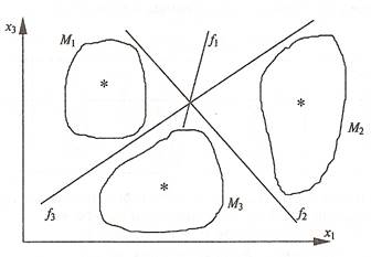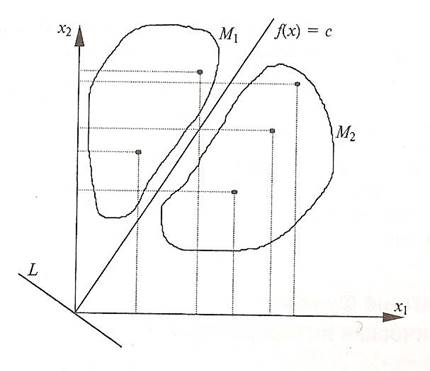 Перед тем как приступить к рассмотрению алгоритма дискриминантного анализа, обратимся к его геометрической интерпретации. На рис. 1 изображены объекты, принадлежащие двум различным множествам М1 и М2 .