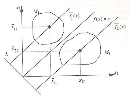 Геометрическая интерпретация этих функций - две параллельные прямые, проходящие через центры классов (множеств) (рис.2).