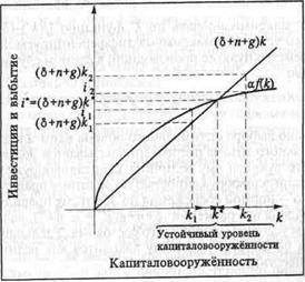 Включение технологического прогресса несколько меняет и анализ состояния устойчивого равновесия, хотя ход рассуждений сохраняется в состоянии устойчивого равновесия (рис.И.5) уровень фондовооруженности k' уравновешивает, с одной стороны, влияние инвестиций, повышающих фондовооруженность, а, с другой сторон, воздействие выбытия, роста числа занятых и технологического прогресса, снижающих уровень капитала в расчете на эффективную единицу труда: s-f(k') = (d + n + g)k'.