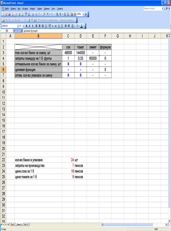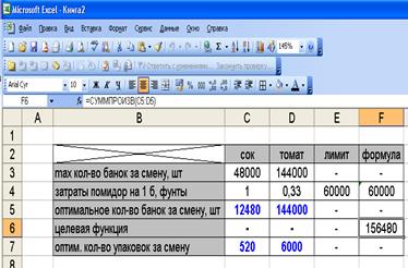 Решения задачи будем проводить с использованием ЭВМ и приложения MicrosoftOfficeExcel пакета MicrosoftOffice. Для решения первого пункта данной задачи, на основе известных данных, составим целевую функцию, обозначив через х1 – количество выпускаемых за смену банок сока, а х2 – количество выпускаемых за смену банок томата: