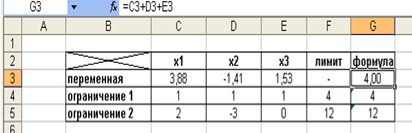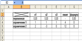 Условия ограничений запишем в ячейках G4 и G5. В ячейке G3 запишем функцию, экстремум которой нам предстоит найти: