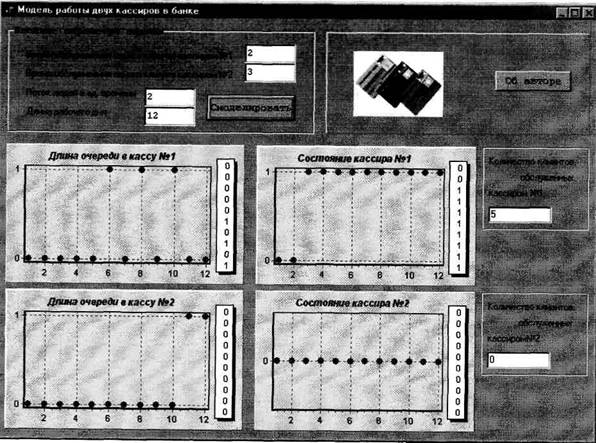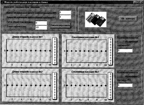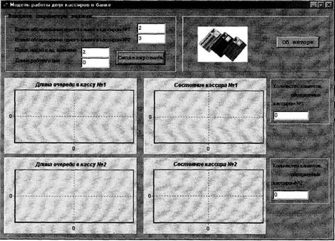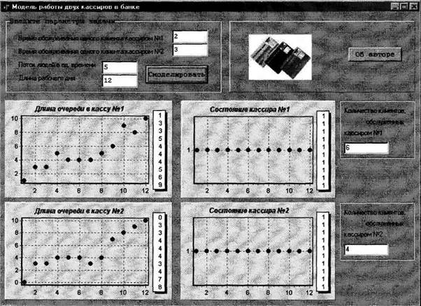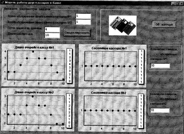 Результат. Результатом работы модели должны быть величины, характеризующие количество обслуженных людей каждым из кассиров, а также графики, отражающие состояние кассиров и очередей к их кассам в каждый момент времени в течение рабочего дня.
