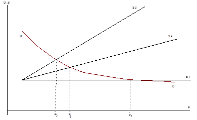 Таким чином, при збільшенні об'єму ресурсів з боку виробництва (Q) ціна рівноваги при незмінному попиті зменшується (див. Мал. 5), де крива пропозиції S1 відповідає фіксованому об'єму ресурсу R