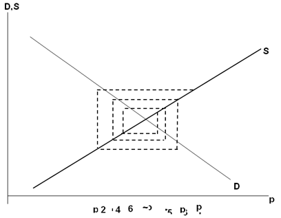 Геометрична ілюстрація цього процесу наближення до рівноваги (мал. 2) нагадує павутину і тому сама модель часто називається павутиноподібною. Можна показати, що збіжність казанного ринкового процесу буде гарантована, якщо виконана умова
