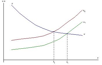 Мал. 2.4. При збільшенні об'єму ресурсів рівноважна ціна зменшується а крива S2 - збільшеному об'єму (