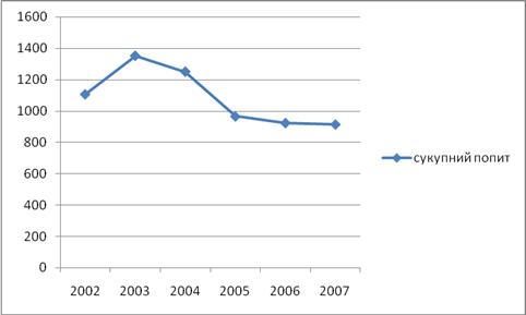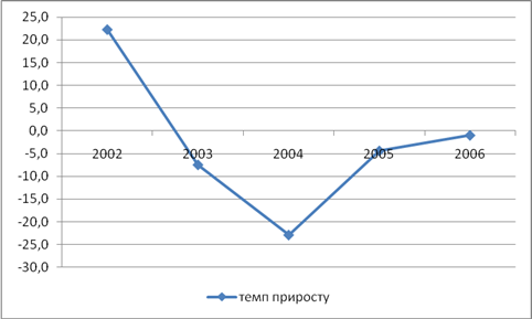 Темп приросту: 2003р – 22,3%, 2004р – -7,5%, 2005р – -22,9%, 2006р - -4,4%, 2007р – -1,0%.