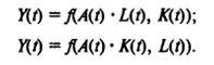 В результате строят двухфакторную ПФf(x1 ,x2 ), или Y=f(K, L). Далее от двухфакторных производственных функций переходят к трехфакторным, при этом в качестве третьего фактора иногда вводятся объемы используемых природных ресурсов. Кроме того, если производственные функции строятся по данным временных рядов, то в качестве особого фактора роста производства можно включить технический прогресс.