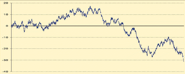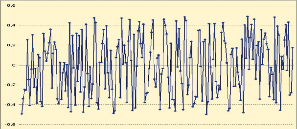 Это хаотическая, по крайней мере, внешне, траектория колебаний вокруг нуля в неком диапазоне. В нашем случае в диапазоне от –0,5 до 0,5. Это вполне соответствует нашим представлениям о том, как такой процесс может выглядеть. Дальше мы последовательно суммируем эти точки и получаем следующую картину.