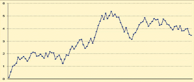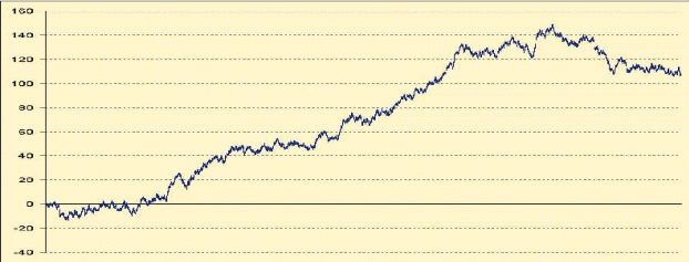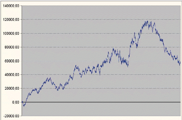 Тоже самое. Никаких колебаний вокруг 0 нет. Многие из таких траекторий будут опять же иметь тредовый вид. Растущие тренды в данном случае будут соответствовать выигрышным торговым системам.