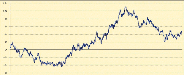 Специалисты, имеющие соответствующее образование обычно засаживались на несколько дней, пытаясь сделать настоящий, правильный генератор. Улучшение качества генератора в этих картинках не изменяет ничего. И мало того, легко показать, что характеристики идеальных случайных блужданий вполне соответствуют тем графикам, которые мы видим. С точки зрения трейдера в первую очередь, это впечатление их трендовости. Психологически мы ожидаем, что случайное блуждание должно все-таки как-то колебаться вокруг нуля. С какими-то отклонениями, уходами, но количество пересечений нулевой оси должно быть значительно больше. Мало того, в 70-е годы, когда все это описывалось у Феллера, был произведен опрос людей, занимающихся математической статистикой - какое количество в среднем пересечений с нулевой осью они ожидают. Результат опроса на порядок отличался от теоретического. В среднем, в 10 раз больше мы ожидаем пересечение с нулевой осью, т.е. намного менее трендовые графики.