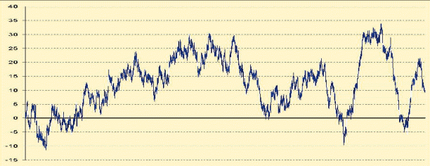 Все ответили, что счет будет колебаться вокруг нуля. Моделируем такую ситуацию. Возьмем S&P с 1991 года, дальше генерим вышеописанным способом столбец из 1 и –1, которые соответствуют длинной или короткой позициям. Посмотрим на варианты графиков сальдо нашего теоретического счета, управляемого случайной торговой системой.