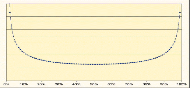 Вышеописанные характеристики случайных блужданий, описываются известным в статистике законом Арксинуса, применительно к нашему последнему примеру – это вероятность того, какую часть от всего отведенного времени точка находится на положительной или отрицательной стороне. Равенство - 50% на положительной стороне и 50% на отрицательной (интуитивно наиболееожидаемый сценарий) – имеет наименьшую вероятность, а максимальную вероятность – сценарий, при котором вся траектория находится либо на одной, либо на другой стороне.