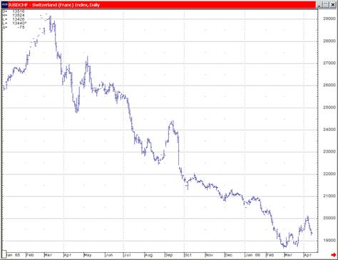 Необходимо просто более объективно воспринимать то, что мы видим в поведении цен и в результатах, которые мы получаем. Приведу пример. Многоуважаемый мною Джон Мерфи, автор наверное лучших книг по техническому анализу в главе, где он дискутирует с приверженцами теории случайных блужданий рынка, коим я ни в коей мере не являюсь, приводит график швейцарского франка за1985 год: