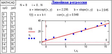Реализация в Mathcad. Линейная регрессия в системе Mathcad выполняется по векторам аргумента Х и отсчетов Y функциями: