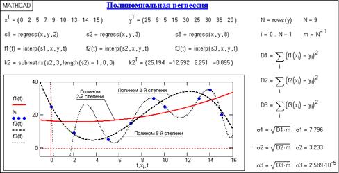 Одномерная полиномиальная регрессия с произвольной степенью n полинома и с произвольными координатами отсчетов в Mathcad выполняется функциями: