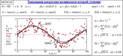 Зональная регрессия. Функция regress по всей совокупности точек создает один аппроксимирующий полином. При больших координатных интервалах с большим количеством отсчетов и достаточно сложной динамике изменения данных рекомендуется применять последовательную локальную регрессию отрезками полиномов малых степеней. В Mathcad это выполняется отрезками полиномов второй степени функцией loess(X, Y, span), которая формирует специальный вектор S для функции interp(S,X,Y,x). Аргумент span > 0 в этой функции (порядка 0.1-2) определяет размер локальной области и подбирается с учетом характера данных и необходимой степени их сглаживания (чем больше span, тем больше степень сглаживания данных).