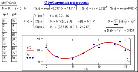 Линейное суммирование произвольных функций. В Mathcad имеется возможность выполнения регрессии с приближением к функции общего вида в виде весовой суммы функций fn(x):