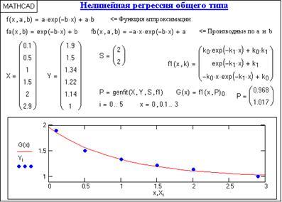 Регрессия общего типа. Второй вид нелинейной регрессии реализуется путем подбора параметров ki к заданной функции аппроксимации с использованием функции genfit(X,Y,S,F), которая возвращает коэффициенты ki, обеспечивающие минимальную среднеквадратическую погрешность приближения функции регрессии к входным данным (векторы Х и Y координат и отсчетов). Символьное выражение функции регрессии и символьные выражения ее производных по параметрам ki записываются в вектор F. Вектор S содержит начальные значения коэффициентов ki для решения системы нелинейных уравнений итерационным методом. Пример использования метода приведен на рис.2.3.2.