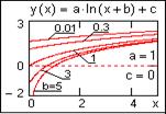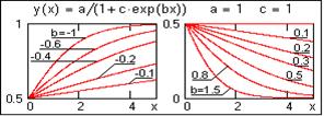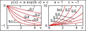 expfit(X,Y,S) – возвращает вектор, содержащий коэффициенты a, b и c экспоненциальной функции y(x) = a·exp(b·x) +c. В вектор S вводятся начальные значения коэффициентов a, b и c первого приближения. Для ориентировки по форме аппроксимационных функций и задания соответствующих начальных значений коэффициентов на рисунках слева приводится вид функций при постоянных значениях коэффициентов a и c.