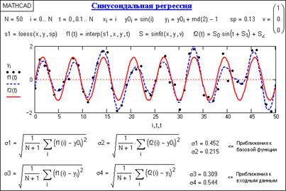 На рис.2.3.3 приведен пример реализации синусоидальной регрессии модельного массива данных по базовой синусоиде в сопоставлении с зональной регрессией полиномом второй степени. Как можно видеть из сопоставления методов по среднеквадратическим приближения к базовой кривой и к исходным данным, известность функции математического ожидания для статистических данных с ее использованием в качестве базовой для функции регрессии дает возможность с более высокой точностью определять параметры регрессии в целом по всей совокупности данных, хотя при этом кривая регрессии не отражает локальных особенностей фактических отсчетов данной реализации. Это имеет место и для всех других методов с заданием функций регрессии.