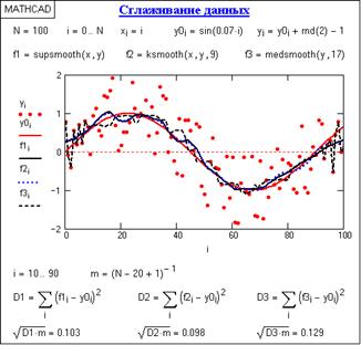 Сглаживание данных, как искаженных помехами, так и статистических по своей природе, также можно считать частным случаем регрессии без определения символьной формы ее функции, а потому может выполняться более простыми методами. В Mathcad для сглаживания применяются следующие функции: