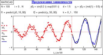 predict(Y,n,K), где n – степень полинома аппроксимации вектора равномерно распределенных данных Y, позволяет вычислить вектор К точек предсказания (экстраполяции) поведения произвольного сигнала за пределами его задания (по возрастанию координат х). Предсказание тем точнее, чем более гладкую форму имеет заданный сигнал. Пример использования функции приведен на рис.2.5 1 для гладкой и статистически зашумленной сигнальной кривой. Степень аппроксимирующего полинома определяет глубину использования входных данных и может быть достаточно небольшой для гладких и монотонных сигналов. Ошибка прогнозирования увеличивается по мере удаления от заданных данных.