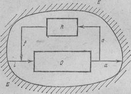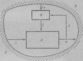 Между управляющей и управляемой системами необходимы каналы связи. По каналу связи, ведущему к управляющей системе от управляемой, передается информация о состоянии последней, точнее, о текущих значениях существенных переменных объекта управления; по каналу связи противоположного направления передается управляющая информация (управляющие воздействия). Таким образом, управляющая и управляемая системы соединены контуром обратной связи. В некоторых случаях канал связи для передачи информации о состоянии объекта управления отсутствует (имеется лишь прямая связь); такие схемы управления весьма ограничены по возможностям и отличаются низкой надежностью. Простейшая схема управления с обратной связью изображена на рис. 1, где R — управляющая система, О — управляемая система (объект управления), Е — среда системы управления, d — канал передачи информации о состоянии объекта управления, f — канал передачи управляющей информации, i — воздействия среды на объект управления, а — выход объекта управления. Эта схема, в частности, адекватно описывает многочисленные механизмы регулирования и технических и биологических системах по принципу гомеостаза.